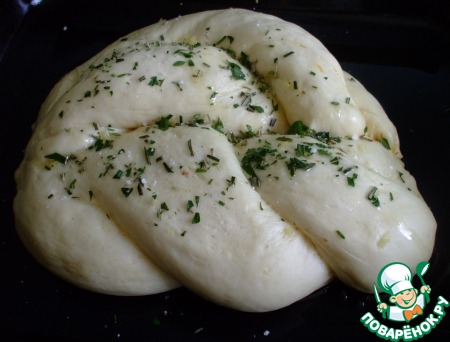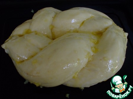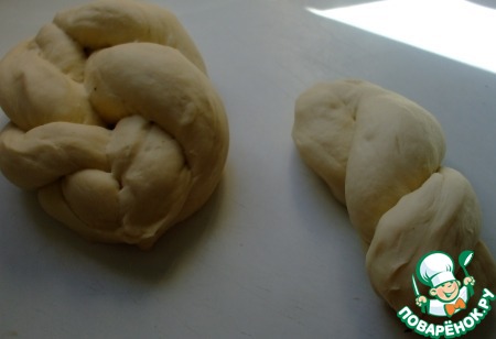 Разделить тесто на 8 равных частей. Каждую часть поделить пополам, раскатать в форме сосиски длиной около 20 см. Соединить по две между собой, заплетая их косичкой. Это –в оригинальном рецепте. Так получились бы булочки-твисты. Примерно как то, что у меня справа на фотографии. Мне нужен был хлеб –поэтому я разделила тесто на 8 частей, раскатала сосисками)), заплела по две в косички, и соединила косички между собой.