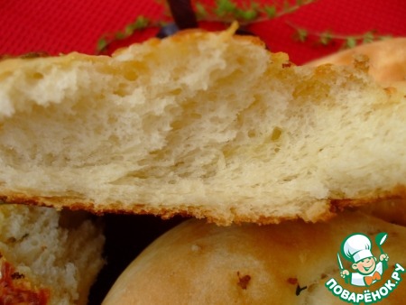 «Выросшие» булочки посыпать порубленным розмарином, мелко натертым пармезаном и каменной солью (я брала морскую, хлопьями). Пармезана в доме не было, зато была дешевенькая моцарелла, купленная для пиццы. Посыпала ей. На фотографии нет этого – я пекла эти булочки два раза за день –мы с мужем быстро расправились с «первой партией» за ужином, очень уж они вкусные и пушистые –и я решила сделать их еще раз –делать –то их –быстрее некуда!)) Но во второй раз забыла добавить сыр…. Ну, точнее, сыр я все-таки добавила на одну, но уже когда она слегка подрумянилась в духовке – когда вспомнила)))