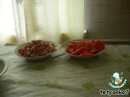 Ветчину мелко нарезаем, томаты нарезаем тоненькими долечками.