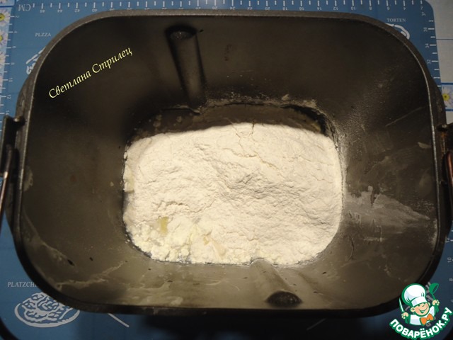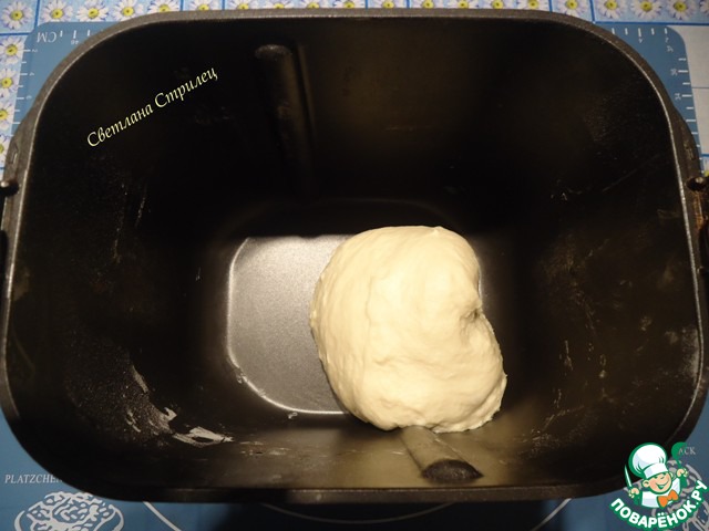 В ведерко хлебопечки закладываем ингредиенты для теста - теплую воду, соль, сахар, дрожжи, яйцо, сухое молоко, размягченное сливочное масло, просеянную муку. Включаем хлебопечку на замес теста (если у Вас нет хлебопечки, тесто тщательно вымешиваем руками).