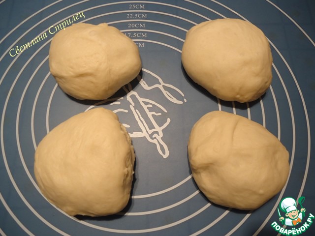 Даем тесту подняться в теплом месте, уминаем, даем ему еще раз подняться. Делим тесто на 4 части.