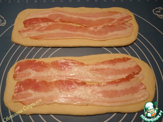 Затем на тесто кладем полоску бекона (если кусочки бекона узкие, то можно положить 2 полоски).