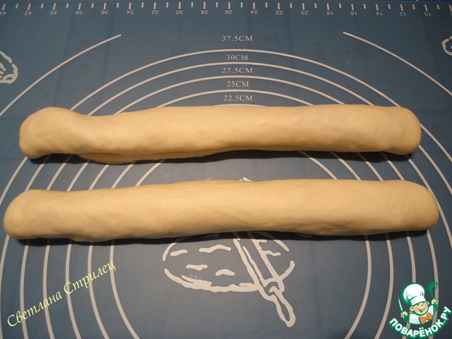 Раскатываем каждую часть теста размером примерно 7x20 см.