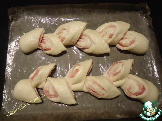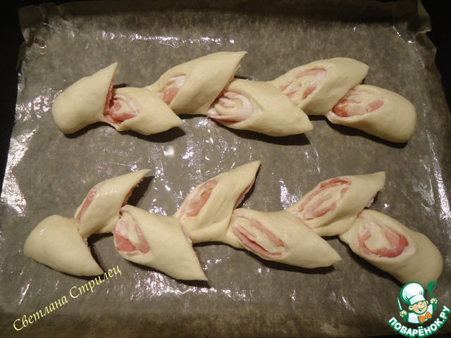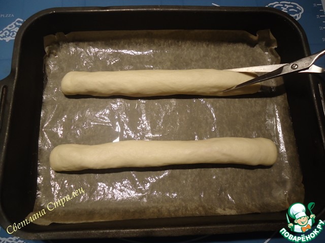 Сворачиваем тесто в жгут и укладываем на противень (противень я застелила пергаментом и смазала маслом).