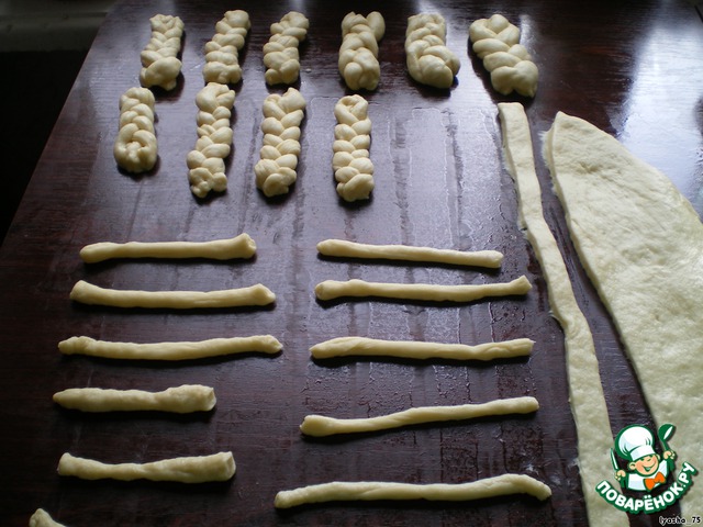 Затем каждую полосочку скатайте жгутиком и разделите ножом на равные части. Берите по три жгутика, плетите косички. Дайте косичкам подойти. На противень, застеленный пергаментом, положите косички.