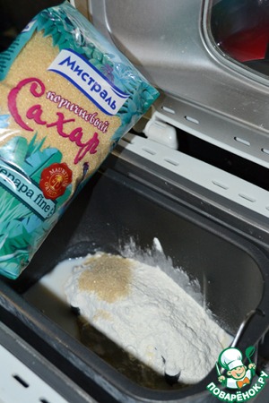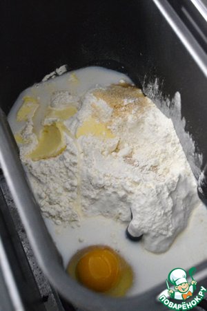 В Х/П: следуйте инструкции вашей хлебопечки. Я кладу 60 мл теплой воды, 60 мл молока, добавляю муку (260-300 г), яйцо, 1 ст. л. мягкого сливочного масла, затем добавляю 3 ст. л. сахара, соль, 1 ч. л. сухих дрожжей. Замешиваю тесто.