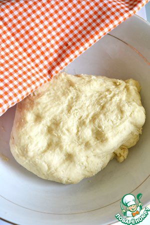 Тесто скатать в колобок, положить в блюдо, накрыть пленкой и оставить в теплом месте для подъема на 1-2 часа, оно должно увеличиться раза в 2.