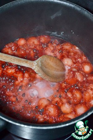 Затем поставить клубнику на средний огонь, можно ягоды раздавить отлкушкой, чтобы было более однородное варенье. Добавить 1 ч. л. крахмала, разведенного в 2 ч. л. воды. Варить пару минут до загустения.