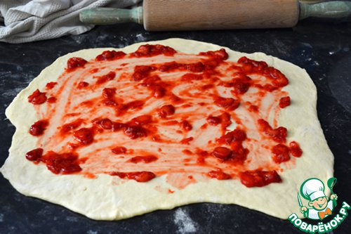 Когда тесто готово, раскатать его в прямоугольный пласт. Толщина пласта - 0,5 см. Смазать его вареньем.