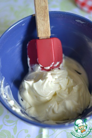 Пока булочки пекутся, сделать помадку: венчиком взбить 2 ст. л. мягкого сливочного масла с 100 г сливочного сыра. Ввести сахарную пудру (50 г) и размешать венчиком до однородной, гладкой массы.