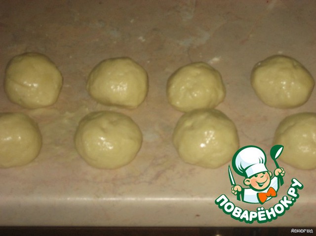 Замесить тесто из творога, муки, яиц, сахара, разрыхлителя до однородной массы. Тесто получается очень липкое. Добавить растительное масло. Сформировать булочки.