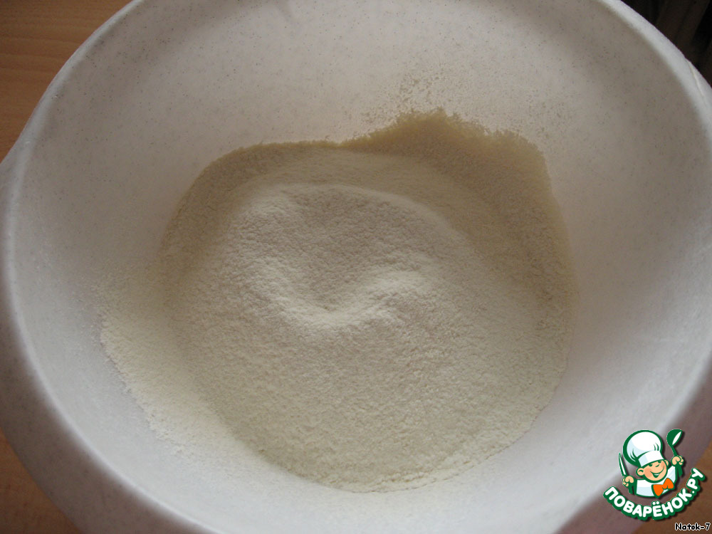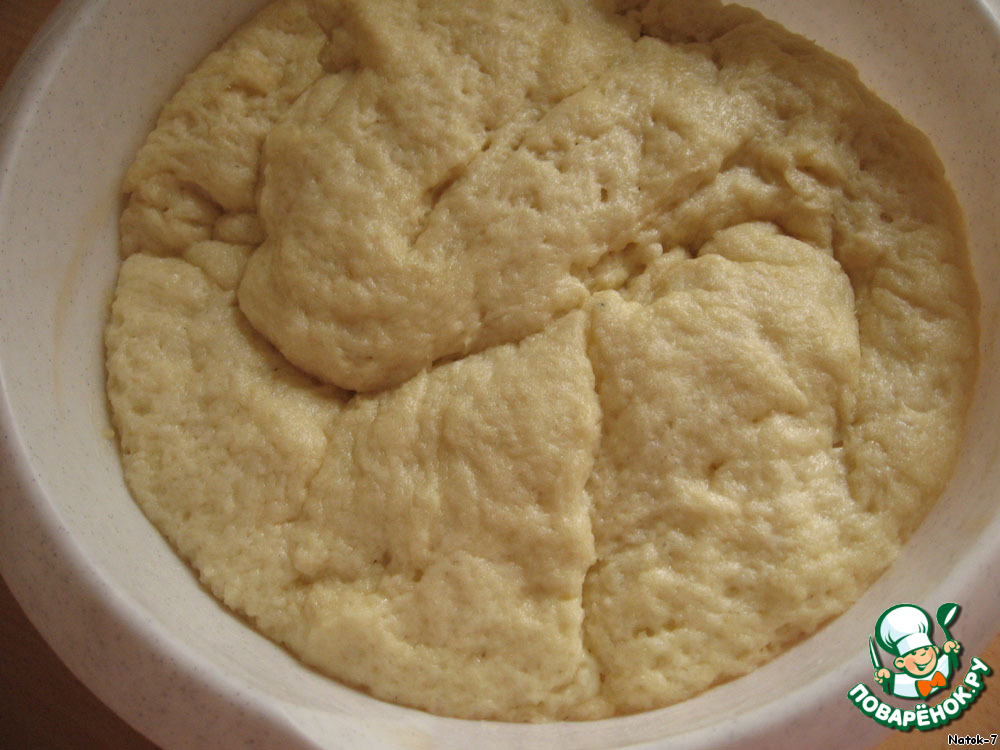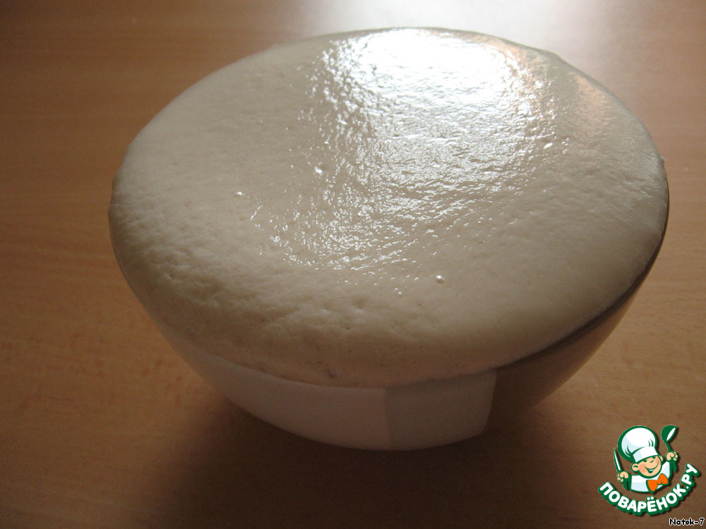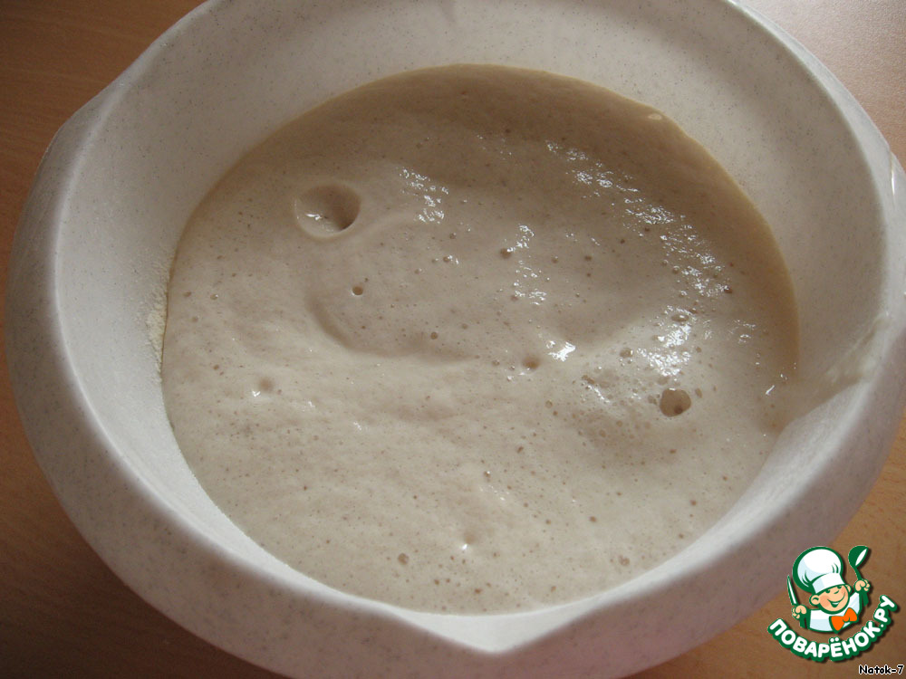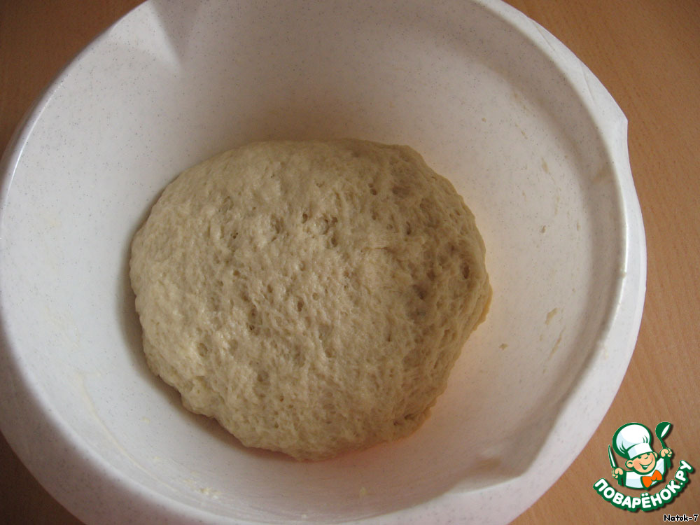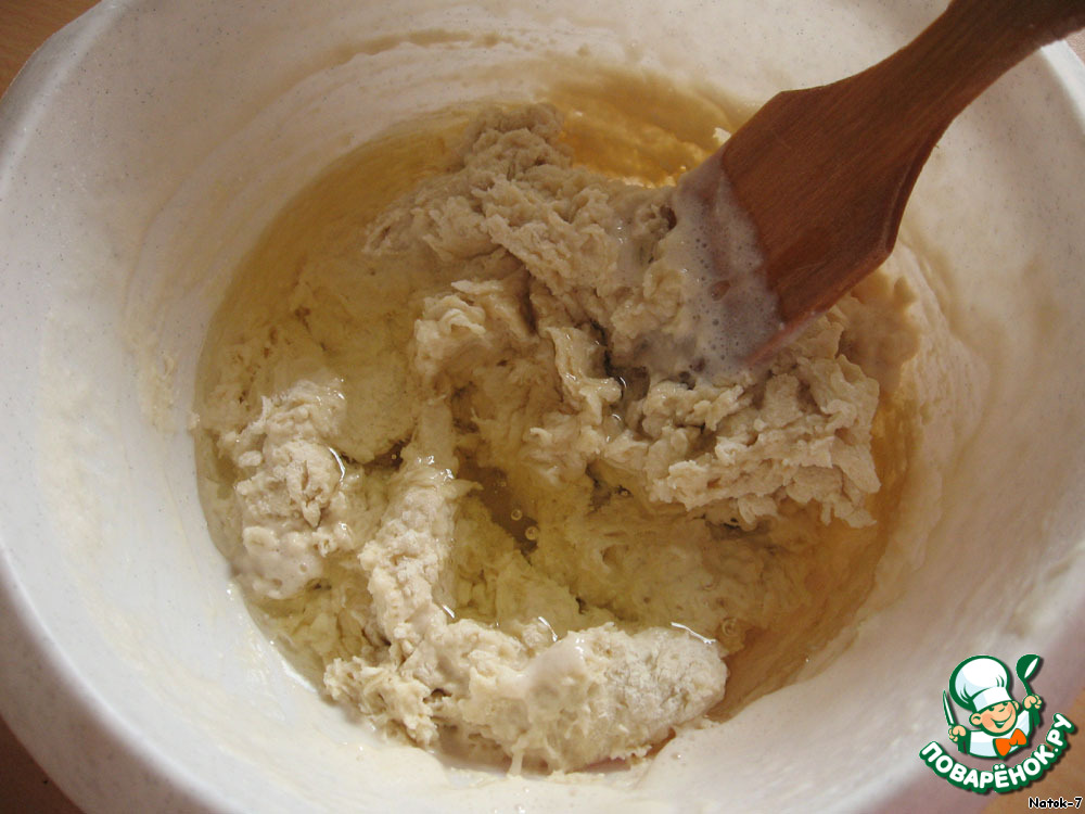 Дрожжи размять и смешать их со слегка подогретым кефиром, дать им расстояться (до шапочки)