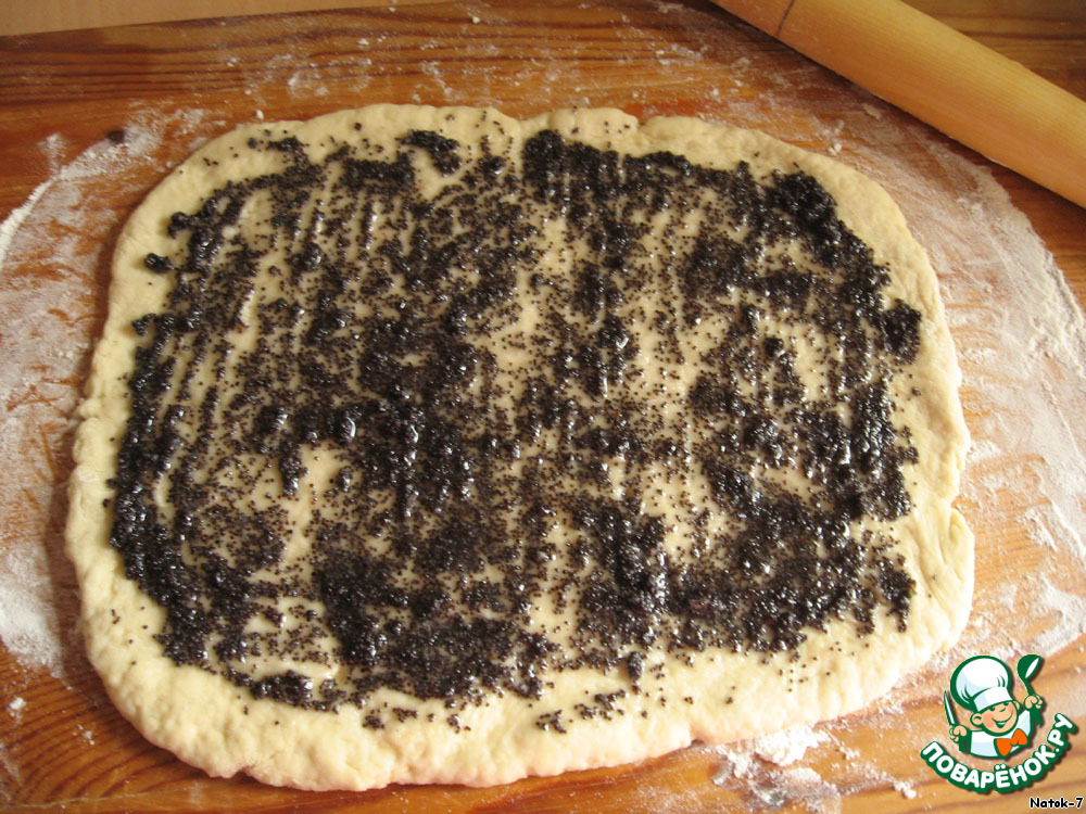 Готовое тесто раскатать в пласт толщиной не менее 1 см. Сверху равномерно намазать маковую начинку.