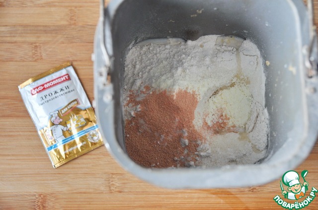 В ведёрко хлебопечи переливаем нагретое молоко, воду, сливочное масло, добавляем одно яйцо, соль, сахар, муку и дрожжи "Саф-момент" для сдобы. Также кладём сухое молоко. В оригинальном рецепте используют лактат кальция. Это пищевая добавка, используемая для улучшения муки и хлеба, а также в качестве регулятора кислотности. Имеет международный номер Е327 и считается безопасной добавкой.