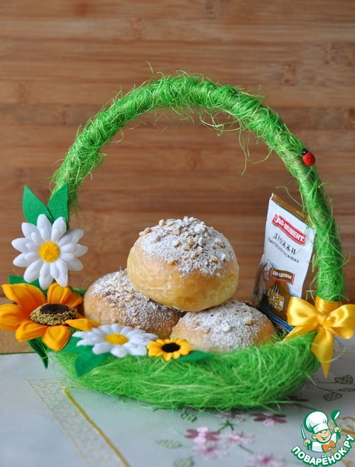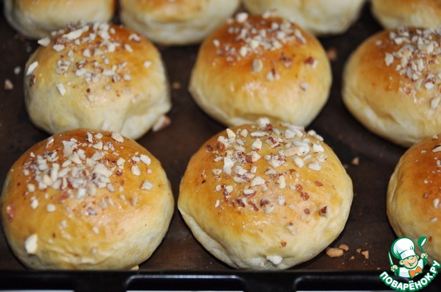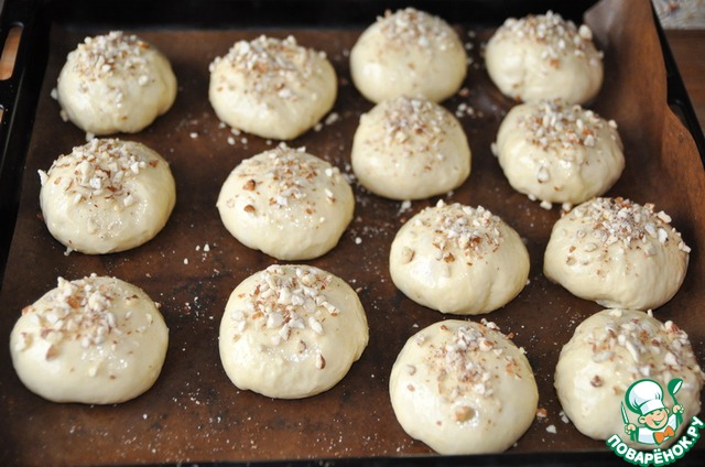 После расстойки смазываем булочки взбитым яйцом и посыпаем дробленым миндалём.