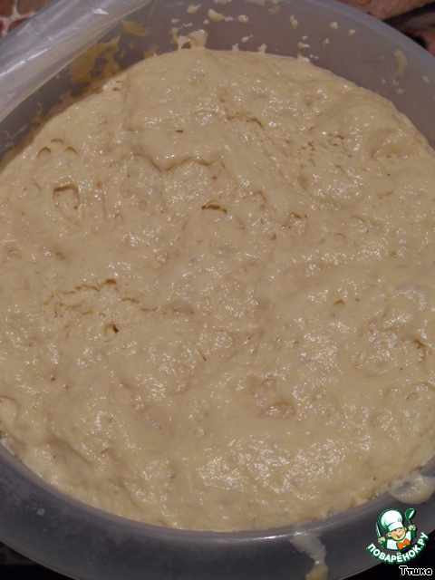 Продолжать перемешивать еще 5-6 минут, пока тесто не станет отходить от стенок. Это мягкое и липкое тесто должно подходить в холодильнике в течение 5-6 часов, поэтому его лучше делать на ночь. Накрыть миску пищевой пленкой и отправить в холодильник.