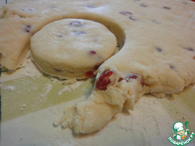 Вырезаем из теста 14 кружков круглой формочкой (диаметр 7 см) и перекладываем на противень. (также, половину сконов можно убрать в морозильник и они могут лежать как полуфабрикат, и если неожиданно нагрянут гости разогреваем духовку, вынимаем сконы из морозилки и выпекаем).