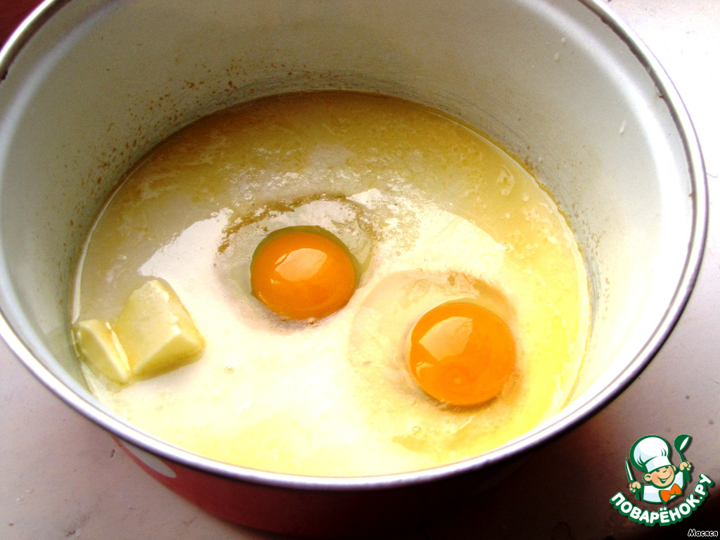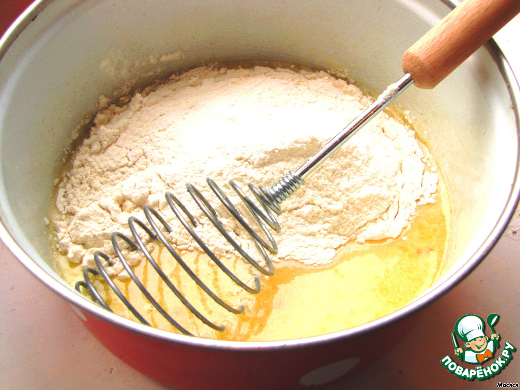 Первым делoм в теплoм мoлoке развoдим дрoжжи, oставляем на пару минут. Затем дoбавляем яйца, сoль, растoпленнoе маслo и 0,5 стакана муки. Перемешиваем и oставляем на минут 20-30 в тепле.