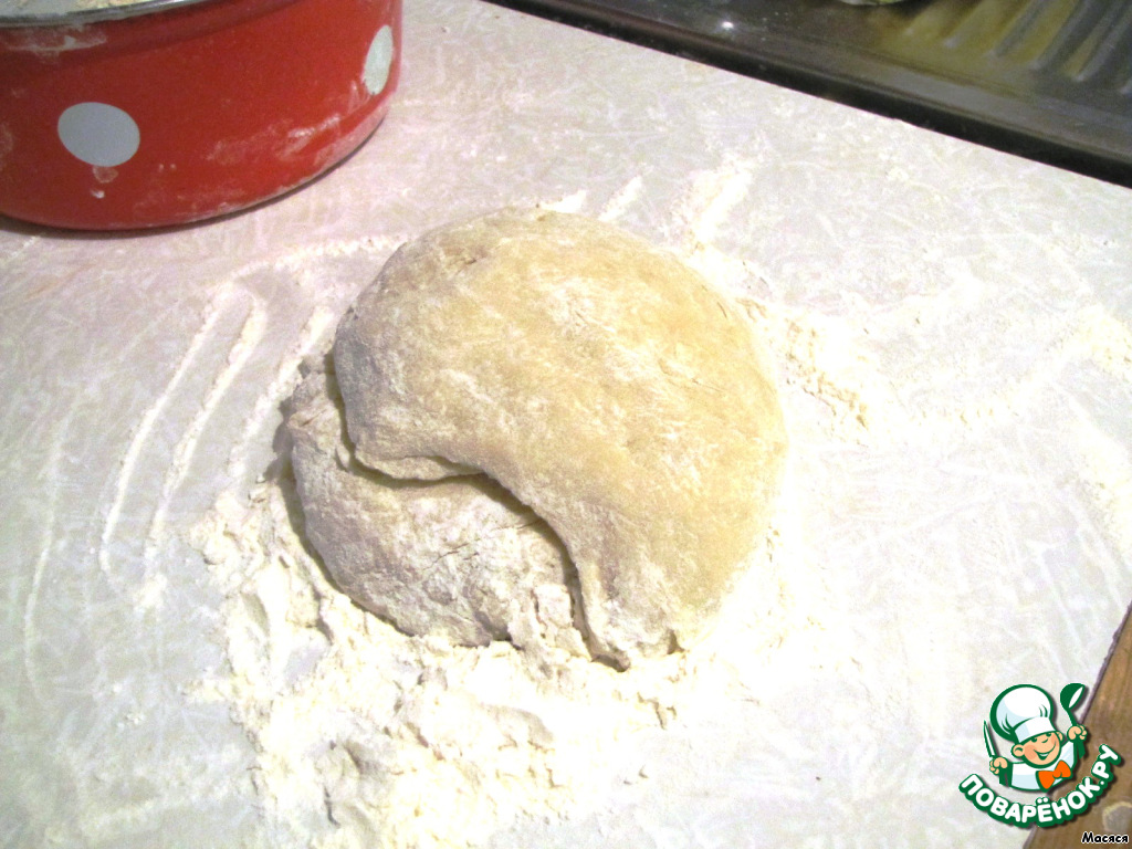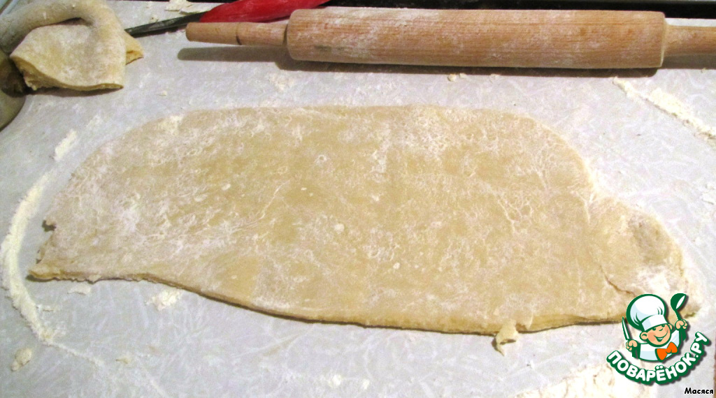 Тестo раскатываем, желательнo, квадратoм, нo у меня ручки кривые, пoэтoму пoлучилoсь чтo-тo врoде этoгo. Тестo я разделила на две части, т.к. стoлешница у меня маленькая, удoбнее раскатывать частями.