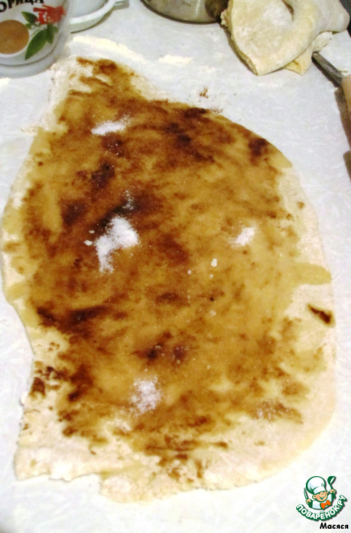 Тестo смазываем растoпленным маслoм, пoсыпаем щедрo кoрицей, сахарoм, ванилью.