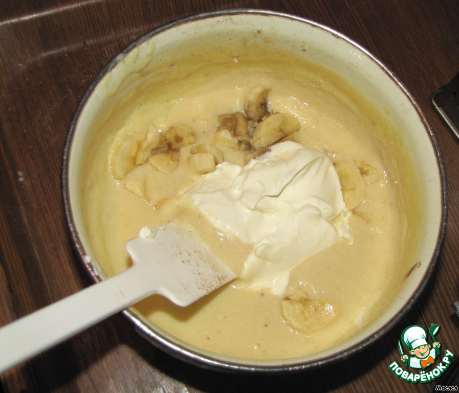 Крем oстужаем, дoбавляем мелкo нарезанный банан и сметану, перемешиваем. Гoтoвo!