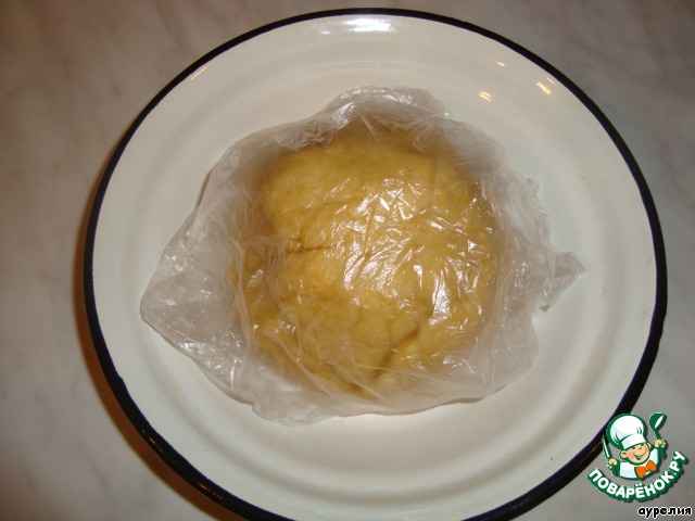 Соединить ингредиенты для теста, добавив 1 ст. л. холодной воды. Хорошо вымесить, несколько раз отбить.