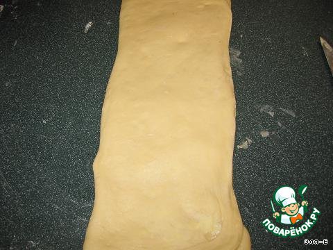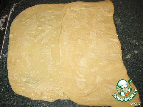 Подошедшее тесто обмять(тесто должно быть прохладным чтобы в нем не плавилось масло),стол посыпать мукой,раскатать тесто в пласт толщиной 5-8 мм. разделить тесто на 3 равные части,но не разрезая а просто наметив контуры обратной стороной ножа.На среднюю часть теста нанести тонкий слой масла,