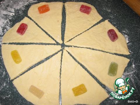 Затем тесто можно поделить на 2 части,тонко раскатать,порезать на сектора,и делать рогалики с любой начинкой,я делала с конфетами "джелли" и с шоколадом