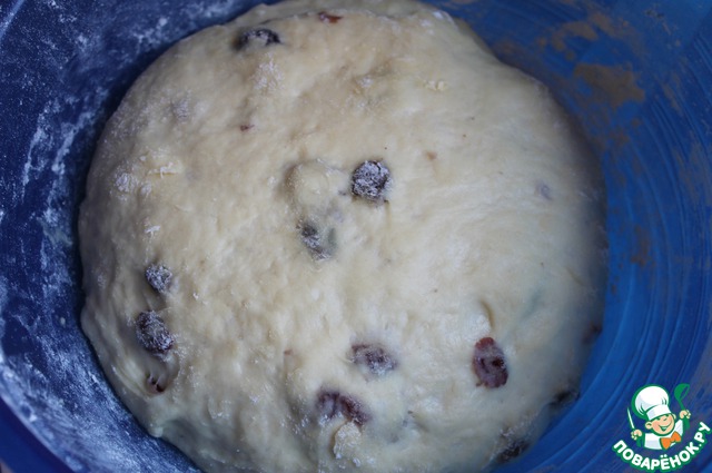 Замесим тесто. Можно в хлебопечке. В теплое молоко добавляем клюкву, я ее залила кипятком на 5 минут, и далее все ингредиенты. Муки может понадобится больше. Тесто поставим подыматься на 1 час. Вот такое оно у нас получится.