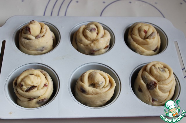 Ставим наши розочки в форму смазаную хорошо маслом. Можно взять и формочки для кексов, тогда будет лучше доставать булочки. Убираем теперь их в духовку на 10 минут на расстойку на 50гр.