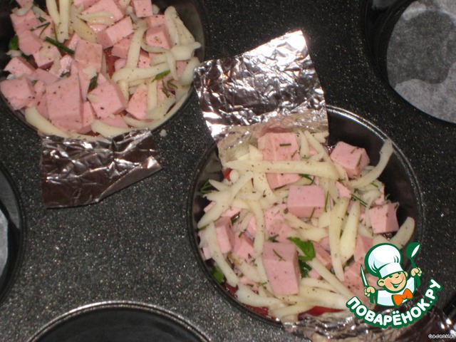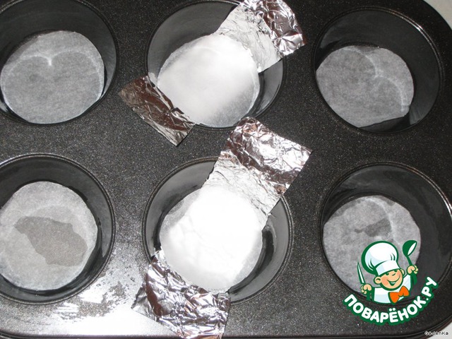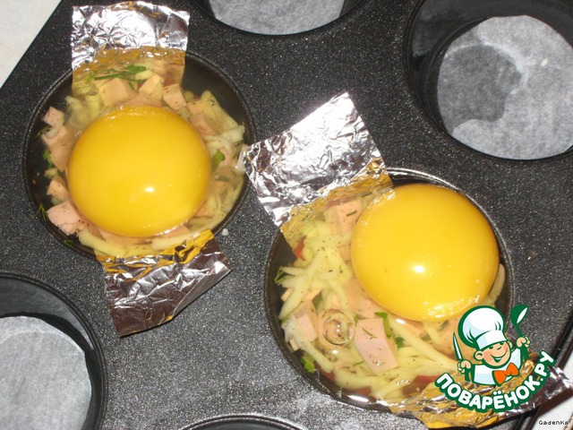Для двух, в который будет запекаться яичница вырезать полоски из фольги или пергаментной бумаги и вложить их в формочки так, чтобы концы свисали, за них потом вытащим наши яйки)))