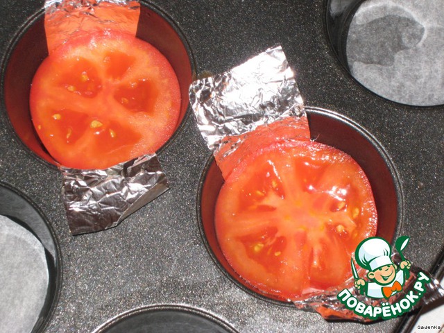 От помидорки отрезать два кружочка и положить на дно двух формочек подготовленных под яичницу.