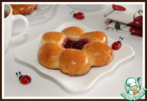 Но, если у вас ее нет. То соедините сначала все жидкие продукты, маргарин растопите и охладите, потом добавьте дрожжи и перемешайте. Затем всыпайте по чуть-чуть муку и перемешивайте лопаткой. Когда тесто нельзя будет таким образом перемешивать, то месите руками. Должна уйти вся мука, но вы все равно должны ориентироваться на свою муку, так как она бывает разная, а тесто нельзя забить ею. Оно должно быть мягким. Затем, переложите тесто в глубокую посуду, накройте пленкой или полотенцем и поставьте в теплое место на 30-40 мин, чтобы оно увеличилось в размере. Время тоже указано приблизительное, следите за тестом. Когда тесто подойдет, обомните его, разделите на две части. Одну разрежьте на 6 равных частей и скатайте из них шарики. Вторую, пока отложите в сторону и накройте пленкой. Каждый шарик раскатайте в лепешку, не тонко. Разрежьте на 6 секторов - лепестков не доходя до середины. Края каждого лепестка соедините друг с другом и подверните слегка вниз, чтобы спрятать защипы.