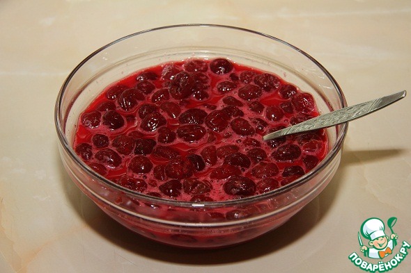 Затем перелейте в жаропрочную посуду и поставьте на огонь. Сначала сильный, чтобы побыстрей нагреть, а потом убавить на минимум. При этом, вишню нужно все время помешивать. Не дайте ей закипеть, ее нужно подогревать. Вы увидите, когда начинка будет готова, она загустеет. Хорошо остудите ее. Начинка готова.