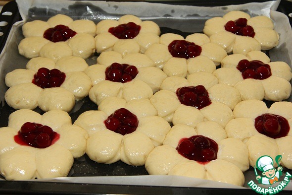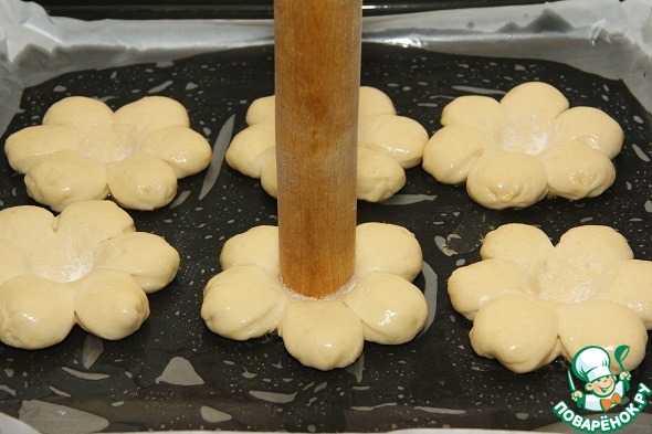 Переложите цветочки на противень застеленный пекарской бумагой и смазанный растительным маслом. У меня была бумага не лучшего качества, хорошую бумагу смазывать не нужно. Проделайте тоже самое со второй частью теста. Противень с булочками поставьте в теплое место, смажьте взбитым яйцом и оставьте для подъема на 15-20 мин. Затем, сделайте углубления в серединке цветочка концом скалки. Чтобы он не прилипал к тесту, макайте его в муку.