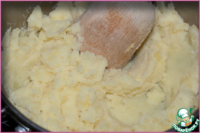 Картофель варим на воде, потом его нужно будет растолочь в пюре и поставить остывать.