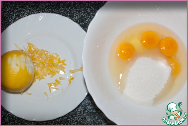 Натереть на крупной терке цедру лимона (где-то 1 столовую ложку), 3 больших или 4 маленьких яйца разбить в миску, высыпать оставшийся сахар, соль и хорошо взбить.