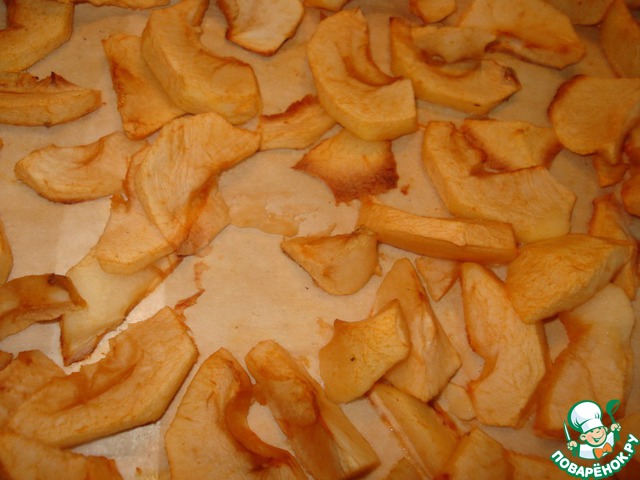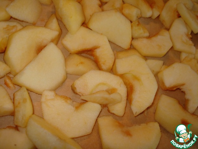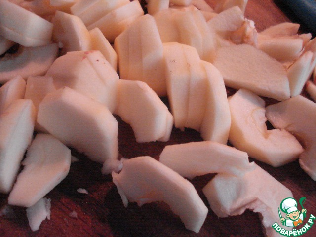 Яблоки почистить, вырезать середину и порезать на тонкие дольки.