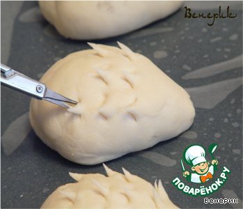 После расстойки теста для ежей ножницами надрезаем сверху колючки, вставляем глазки и носик из черного перца горошка.