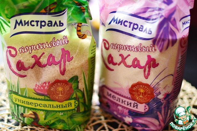 В этом рецепте мне понадобился сахар двух сортов. Для теста - Мистраль универсальный, а для сиропа - Мистраль коричневый мелкий.