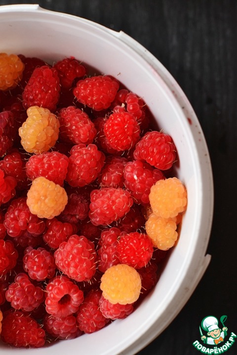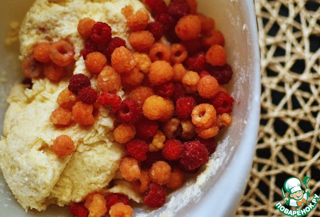Стакан малины вмесить в тесто. Эту грязную работёнку можно доверить детям. Пусть потренируют руки.