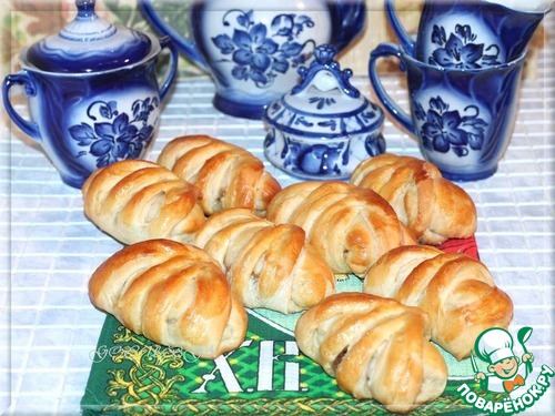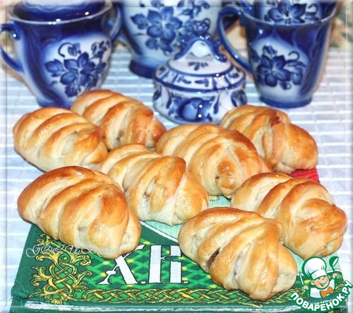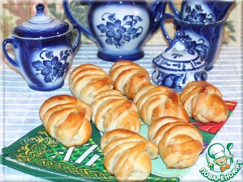Подошедшие булочки смазываем взбитым желтком с 1 ст. л. молока. Ставим противень с булочками в разогретую духовку до t 180 С на 5 минут, затем переключаем на t 200 С и выпекаем еще 15 минут до румяного цвета. С двумя остальными частями теста поступаем так же.
