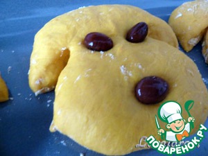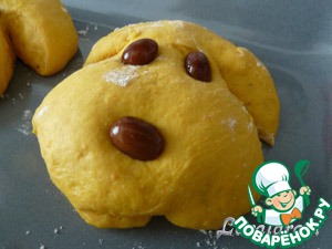 Булочки - "собачки" получаются смешные; а также яркие за счёт тыквенного пюре в составе теста.