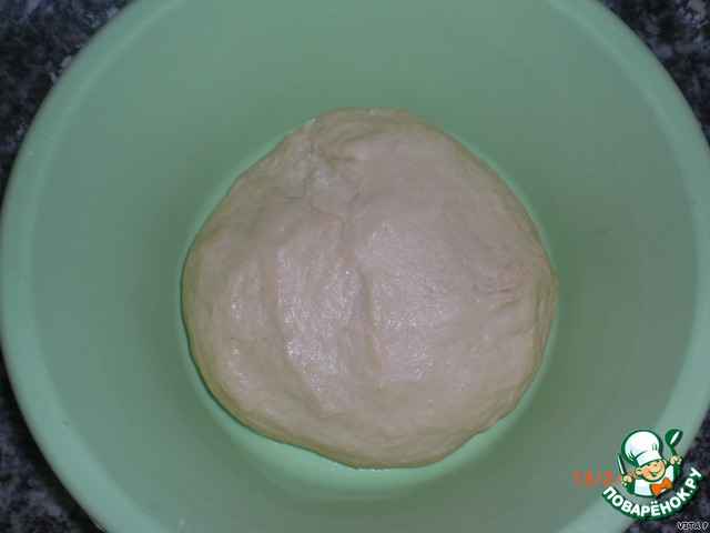 В муку добавляем дрожжевую и яичную массу, соль и замешиваем очень мягкое тесто. Выкладываем на посыпанный мукой стол и вымешиваем до однородного состояния. Выкладываем в миску смазанную растительным маслом и оставляем для подъёма на 1-1,5 часа.