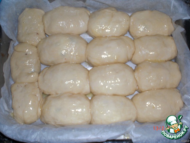 Мягкое, подошедшее тесто разминаем и оставляем на 10 минут. Делим на небольшие кусочки, где-то 16 штук, в руках формируем лепёшку - тесто очень мягкое, и кладём начинку, защипываем края, смазываем низ и бока растопленным маслом и рядышком друг к другу выкладываем в высокий противень. Ставим для подъёма, пока будет греться духовка (где-то 200 градусов). Смазываем маслом и выпекаем минут 20 до золотистой корочки.