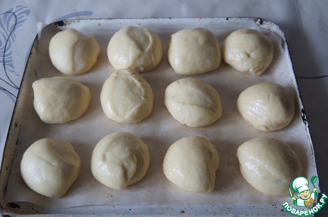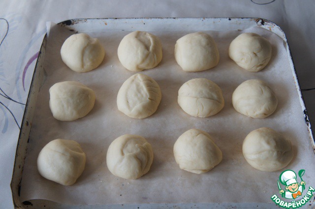 Потом сформировать из теста шарики одинакового размера и положить их на застеленный промасленной пекарской бумагой противень подходить на полчаса.