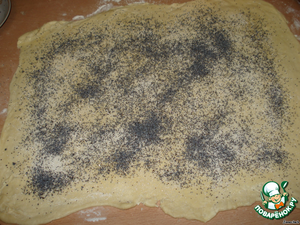 Затем полученное тесто разделить на 2 части, раскатать тонко 1 часть, посыпать сахаром, изюмом или маком.