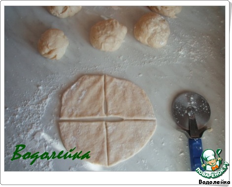 Шарик раскатать в лепешку и разрезать на 4 части (как на фото).