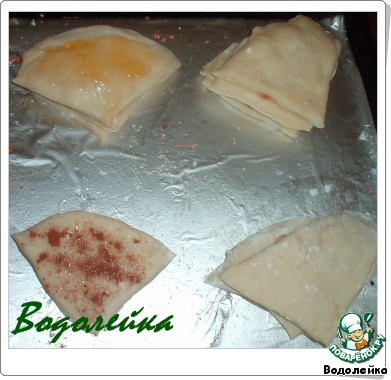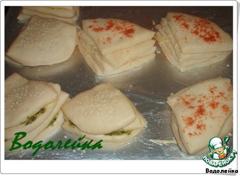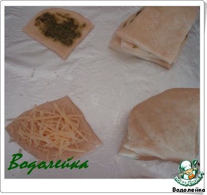 Противень смазать маслом (можно застелить пекарской бумагой). И начинаем формировать булочки, выкладываем один на другой наши треугольнички (ровность краев не имеет значения). При этом на каждый слой что-то выкладываем. Я делала закусочные булочки с тертым твердым сыром и соусом из зелени.