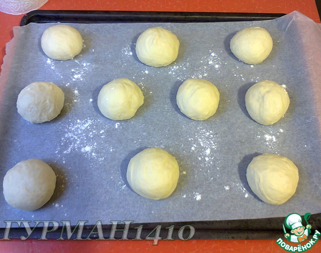 19. На противень застелить кальку, посыпать слегка мукой и уложить шарики из теста.